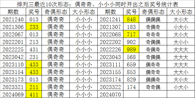 排列三最近10次同时开出奇偶形态:偶奇奇和大小形态:小小小时其奖号分别为:013-233-013-213-431-231-433-433-013-211-411,下期分别开出号码为:848-183-717-902-989-568-659-853-829-174,详细统计见下表: