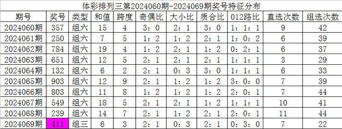 开奖公告:体彩排列三第2024069期开出奖号:411。组三,无重号,奇偶比2:1,大小比0:3,012比0:3:0,和值6,跨度3。