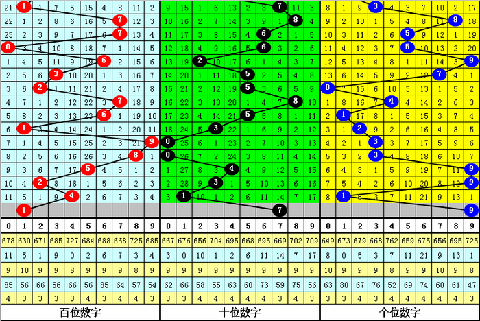 第二位3-6之间的中号开出13个,目前遗漏1期,其中号码6出现3次,目前遗漏11期;号码5出现5次,目前遗漏6期;号码4出现2次,目前遗漏2期;号码3出现3次,目前遗漏1期。