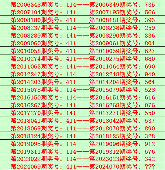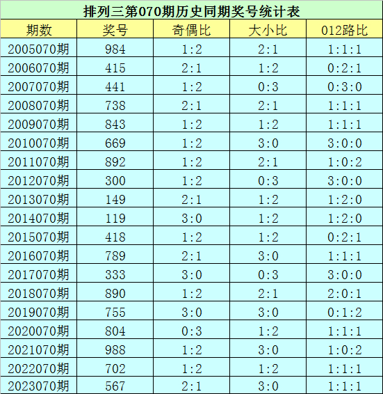 排列三第2024070期开奖日期:2024年3月20日,历史上第070期已开出了19次奖号,历年同期号码分别为:984、415、441、738、843、669、892、300、149、119、418、789、333、890、755、804、988、702、567。