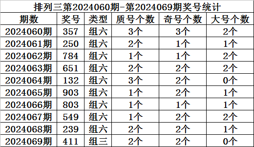 上期回顾:排列三第2024069期开奖:411,质合比为2:1,奇偶比为0:3,大小比为2:1。