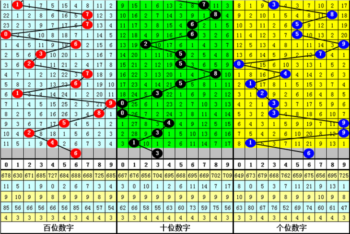 百位:上期开出4,偶数,偶号最近两周开出较少,连出2期,本期再次开出,参考6。