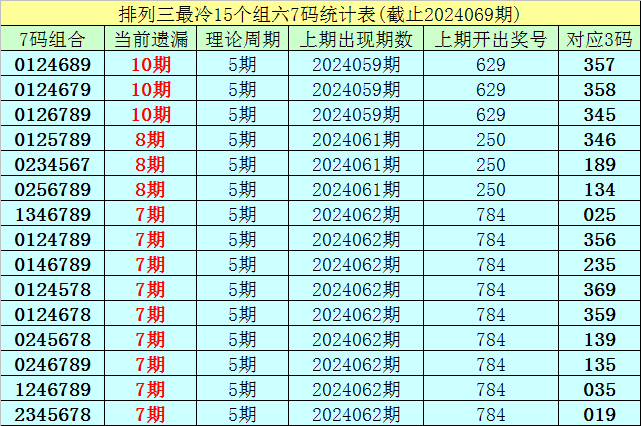 (1)在排列三已开出的6841期奖号中(统计截止第2024069期),目前7码组六遗漏值最大的组合为:0124689、0124679、0126789,本期遗漏10期;