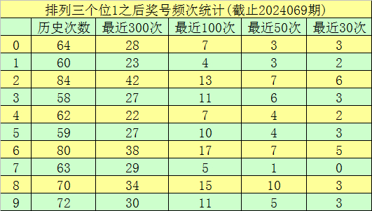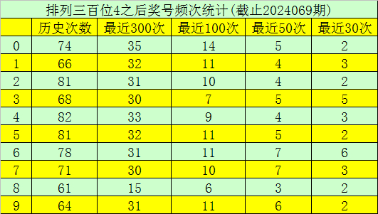 第一位杀号:上期第一位奖号为4,第一位奖号4历史上出现727次,前100次该位开出奖号4之后,下期号码0-9出现次数从高到底分别为:号码0→14次,1、5、6、9→11次,2、7→10次,4→9次,3→7次,8→6次。