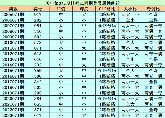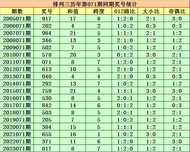 历史上第2024071期排列三已开出19期奖号了,历年同期奖号分别为:917、202、984、346、502、578、071、613、040、292、759、530、842、503、205、384、655、371、017,详细统计见下表: