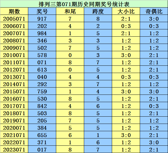 历年第071期排列三同期奖号开出:917、202、984、346、502、578、071、613、040、292、759、530、842、503、205、384、655、371、017。