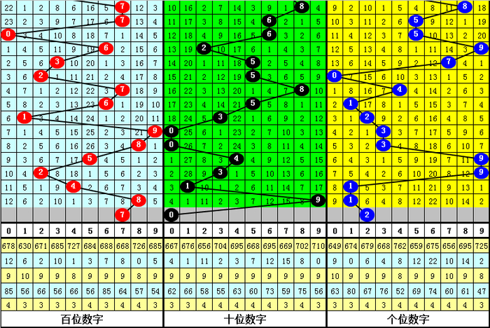 大中小分析:在组选0-9号码分布图中,前10期小号(0-2区段)出现11枚奖号,中号(3-6区段)出现11枚奖号,大号(7-9区段)出现8枚奖号,上期中号区域没有落号,本期看好中号码走冷,注意3-6区段不落号。