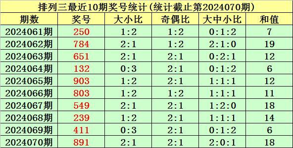 上期回顾:排列三第2024070期奖号为:891。奖号类型:组六,和值:18,奇偶比:2:1,跨度:8,大小比:2:1。
