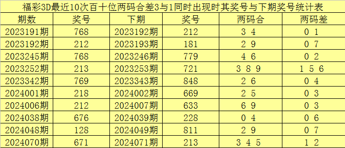 百十位合差分析:上期奖号百十位开出21组合,两码合为3,两码差为1,最近10次百十位两码合3与两码差1同时出现时,其奖号和下期奖号分别为: