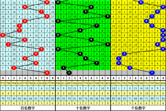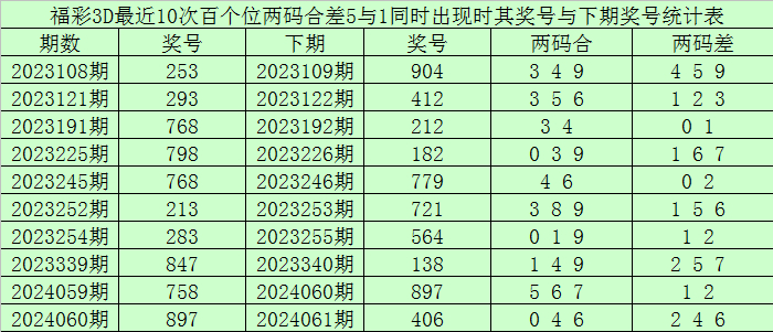 从以上统计可以看出,百十位两码合差3与1同时出现之后其下期两码合差表现最热的4个分别为:0236,本期百十位两码合差可以参考这四码中的数据。