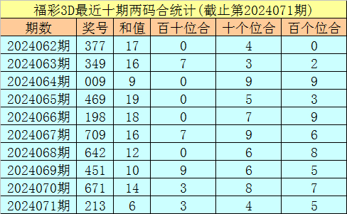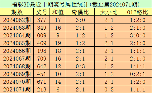 开奖回顾:第2024071期福彩3D奖号为213。奖号形态为组六,大小比为0:3,和值为6,奇偶比为2:1,012路比为1:1:1,跨度为2。