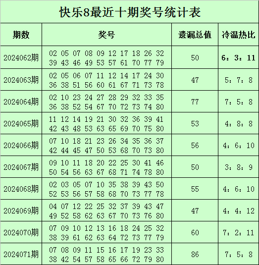 福彩快乐8第2024071期开奖回顾:07 08 09 11 15 16 17 19 23 33 38 42 54 57 58 65 66 72 79 80,其中冷温热码比为4:7:9,遗漏总值为86。