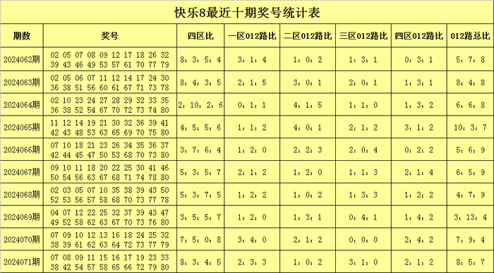 福彩快乐8第2024071期开奖回顾:07 08 09 11 15 16 17 19 23 33 38 42 54 57 58 65 66 72 79 80,其中奖号四区比为8:3:4:5,012路比为8:5:7,和值为769,跨度为73。