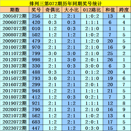 开奖回顾:排列三第2024071期开出奖号258,奖号012路比为0:0:3,大小比为2:1,奇偶比为1:2,最近三年第072期同期开出奖号为:第2021072期:562、第2022072期:683、第2023072期:447。