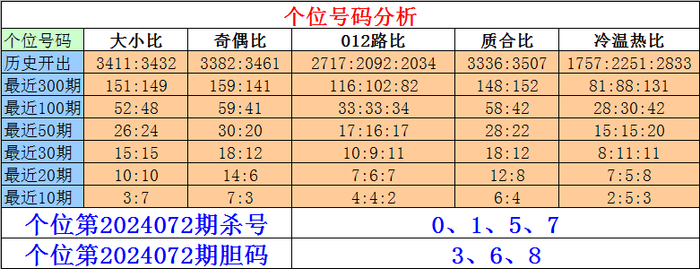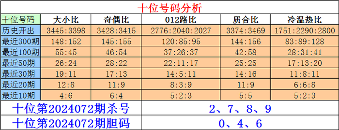 近期十位偶数表现较冷,目前遗漏4期,本期适当关注偶数回补;该位温冷号码近期出现较少,最近3期连续开出温冷号码,本期防温冷号码继续回补。十位杀号:2789,胆码关注:046。