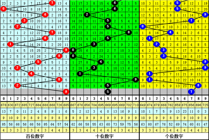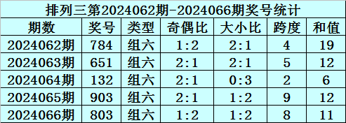 跨度分析:最近5期分别开出跨度:5、7、3、8、6,本期注意跨度走小,参考跨度4。