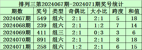 上期回顾:排列三第2024071期开奖号码为258。奖号类型为组六,奇偶比为1:2,大小比为2:1,跨度为6,和值为15。