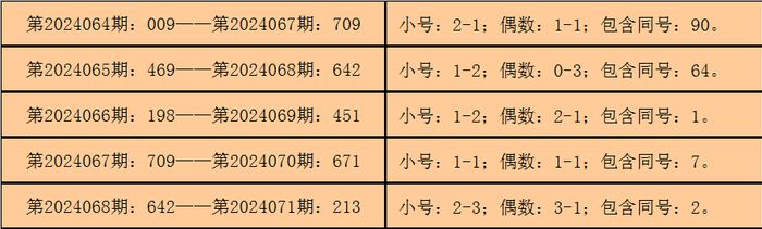 统计3D历史上已开出的奖号发现,在连续5期开奖号码中:3D在第2024064期-第2024068期分别开出奖号:009-469-198-709-642。