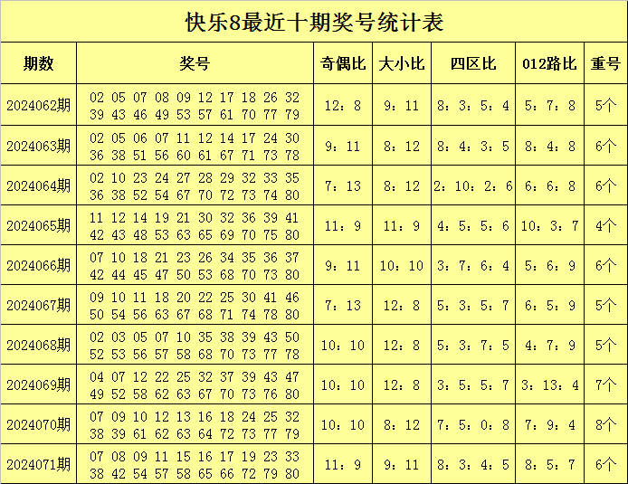福彩快乐8第2024071期开奖回顾:07 08 09 11 15 16 17 19 23 33 38 42 54 57 58 65 66 72 79 80,其中奖号奇偶比为11:9,大小比为9:11,四区比为8:3:4:5,012路比为8:5:7,重号6个:07、09、16、38、72、79。