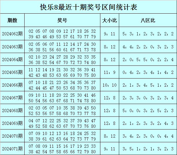 福彩快乐8第2024071期奖号为:07 08 09 11 15 16 17 19 23 33 38 42 54 57 58 65 66 72 79 80,其中奖号大小比为9:11,八区比为3:5:1:2:1:3:2:3。