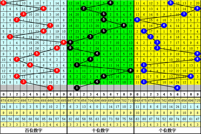 百位分析:该位上期奖号为3,出现0路、奇数、小号,在前11期奖号,该位012路比为3:3:5,012路号码出号相当,目前012路号码遗漏期数分别为0、3和1,近期百位注意1路号码走热。
