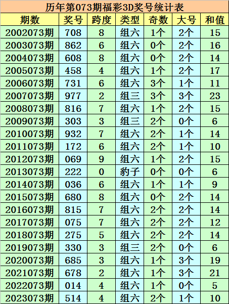 历年第073期福彩3D同期奖号为:708 - 862 - 608 - 458 - 731 - 977 - 816 - 303 - 932 - 172 - 069 - 222 - 036 - 680 - 815 - 075 - 275 - 330 - 685 - 678 - 014 - 514。