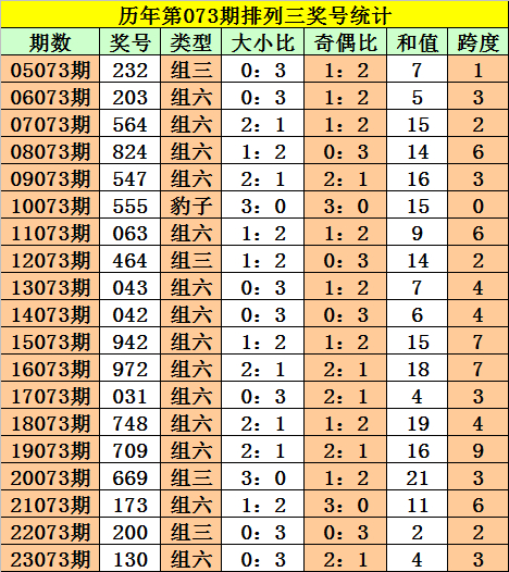 历年第073期排列三奖号:232 - 203 - 564 - 824 - 547 - 555 - 063 - 464 - 043 - 042 - 942 - 972 - 031 - 748 - 709 - 669 - 173 - 200 - 130。