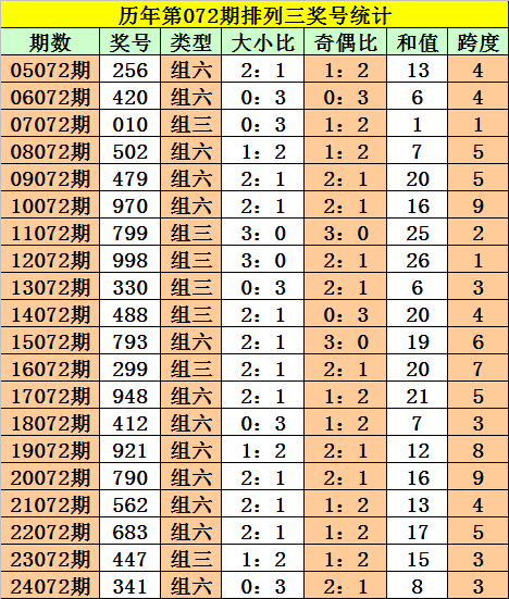 排列三第2024072期奖号:341,和值8,跨度3,大小比0:3,奇偶比2:1。