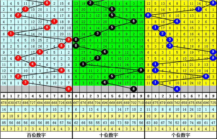 百位:近期大小号码出现次数基本相当,小号目前连续开出2期,本期不看好小号,注意大号回补;另外,在最近14期奖号中,该位0路和2路号码表现非常活跃,占开奖总数的78.6%,本期继续关注0路或2路号码开出,关注号码9。