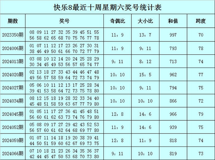 福彩快乐8第2024066期(上周六)开奖回顾:07 10 18 21 23 26 34 35 36 37 42 44 45 47 50 53 68 70 73 80,其中奖号和值为819,跨度为73,奇偶比为9:11,大小比为10:10。