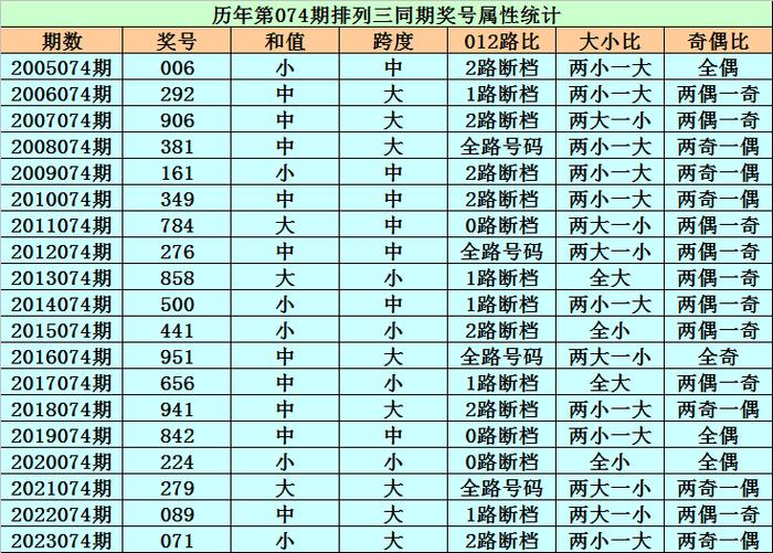 历史上第2024074期排列三已开出19期奖号了,历年同期奖号分别为:006、292、906、381、161、349、784、276、858、500、441、951、656、941、842、224、279、089、071,详细统计见下表: