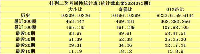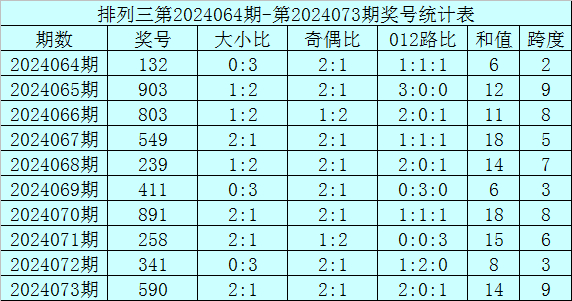 上期回顾:排列三第2024073期奖号为590,奖号012路比为2:0:1,奇偶比为2:1,大小比为2:1,和值为14,跨度为9。