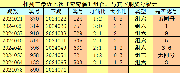 开奖回顾:排列三第2024073期开奖号码为:590。奖号类型为:组六,大小类型为:大大小,奇偶类型为:奇奇偶,无重号。