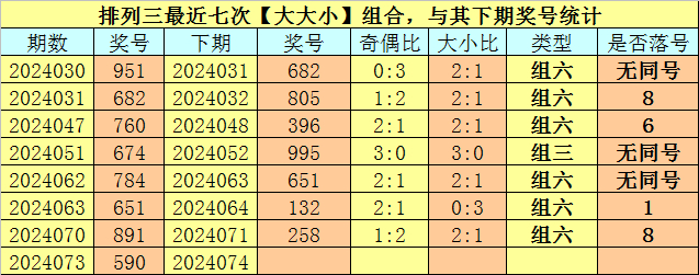 大小分析:排列三上期开出号码590,大小类型为【大大小】,最近七次开出大小类型大大小的奖号分别为:951、682、760、674、784、651、891,其下期分别开出号码:682、805、396、995、651、132、258。其中号码大小比为13:8,大号出现比例较高,本期看好大号继续热出,大小比参考2:1。