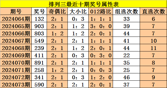 上期回顾:体彩排列三第2024073期奖号:590,奇偶比2:1,大小比2:1,012比2:0:1。