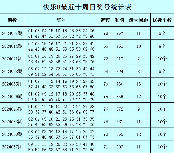 福彩快乐8第2024067期(上周日)回顾:09 10 11 18 20 22 25 30 41 46 50 54 56 63 67 68 71 74 78 80,其中奖号首尾间距为71,和值为893,最大间距为11,尾数分布为:尾数2、3、5、7、9包含1个号码,尾数4、6包含2个号码,尾数1、8包含3个号码,尾数0包含5个号码。