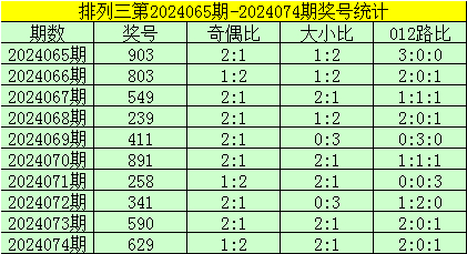 开奖回顾:排列三第2024074期奖号为:629,其奇偶比为1:2,大小比为2:1,奖号012路比为2:0:1。