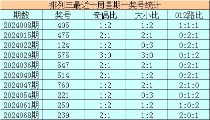 排列三十周星期一分别开出奖号:239、250、221、760、514、547、575、124、475、405,其中号码奇偶比为16:14,奇偶号码出现比例相当;号码大小比为13:17,大小号码开出个数相当;号码012路比为6:12:12,0路号码走冷。