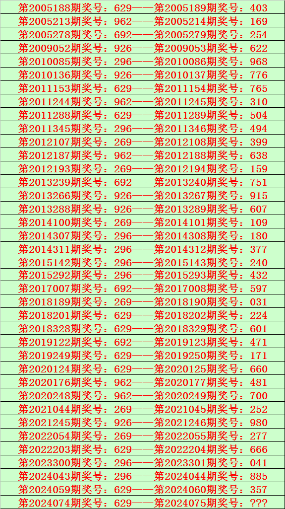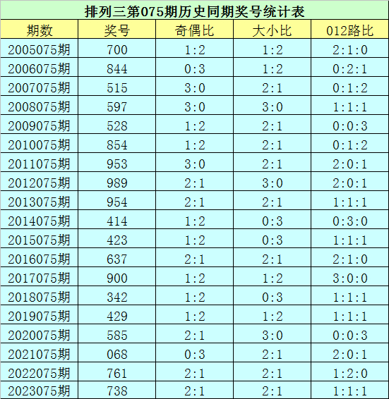 排列三第2024075期开奖日期:2024年3月25日,历史上第075期已开出了19次奖号,历年同期号码分别为:700、844、515、597、528、854、953、989、954、414、423、637、900、342、429、585、068、761、738。