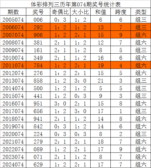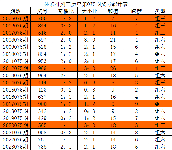 在历年排列三第075期开奖中:组三号码出现7次,组六号码出现12次。组三、组六号码出现比例持平,本期奖号形态关注:组六号码。