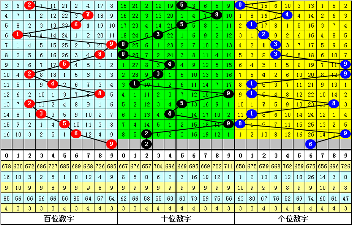 百位分析:该位上期开出号码6,最近10期该位012路比为3:1:6,其中0路号码间隔1期再次出现,本期该位防0路号码再次出现,参考号码9。