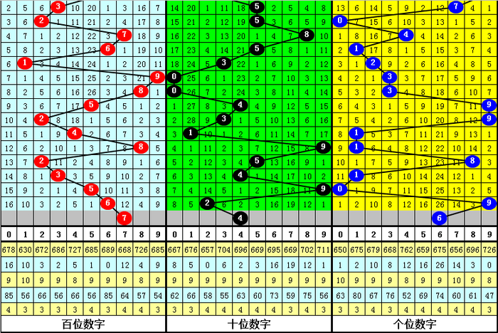 跨度分析:最近5期分别开出跨度:8、6、3、9、7,本期注意跨度走小,参考跨度3。