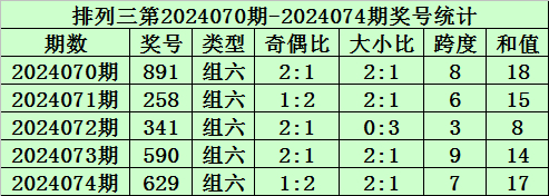 上期回顾:排列三第2024074期开奖号码为629。奖号类型为组六,奇偶比为1:2,大小比为2:1,跨度为7,和值为17。