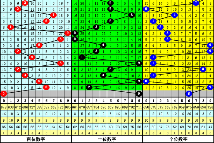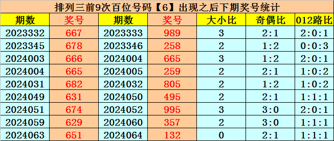 百位号码:百位上期奖号为2路、奇数、大号:6,历史上百位号码6共开出689期,前一次开出期数在第2024063期,上期奖号隔10期再次开出。