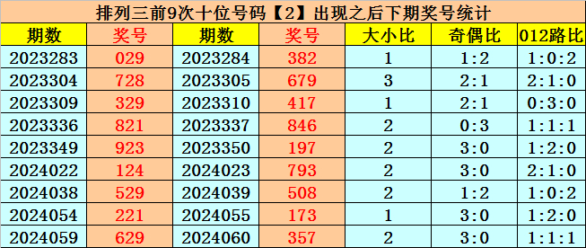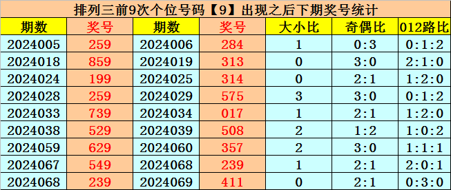 个位号码:上期奖号为大号、奇数、0路号码:9,历史上个位号码9共开出726期,前一次出现在第2024068期,上期遗漏5期再出。