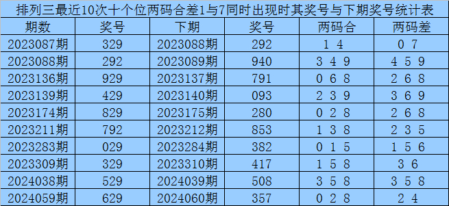 从以上统计可以看出,十个位两码合差1与7同时出现之后其下期两码合差表现最热的4个分别为:2358,本期十个位两码合差可以参考这四码中的数据。