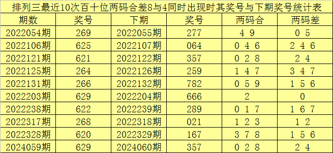 从以上统计可以看出,百十位两码合差8与4同时出现之后其下期两码合差表现最热的4个分别为:0124,本期百十位两码合差可以参考这四码中的数据。