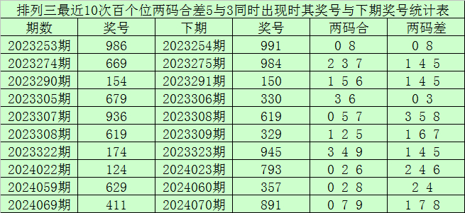 百个位合差分析:上期奖号百个位开出69组合,两码合为5,两码差为3,最近10次百个位两码合5与两码差3同时出现时,其奖号和下期奖号分别为: