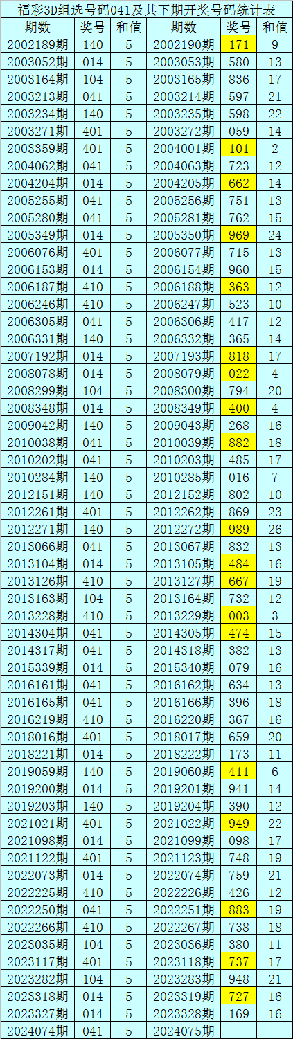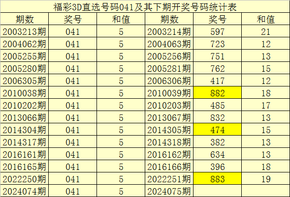 二、组选分析:历史上组选号码041开出了58次,其下期奖号分别为:171-580-836-597-598-059-101-723-662-751-762-969-715-960-363-523-417-365-818-022-794-400-268-882-485-016-802-869-989-832-484-667-732-003-474-382-079-634-396-367-659-173-411-941-390-949-098-748-759-426-883-738-380-737-948-727-169,其开出期数和下期奖号统计为: