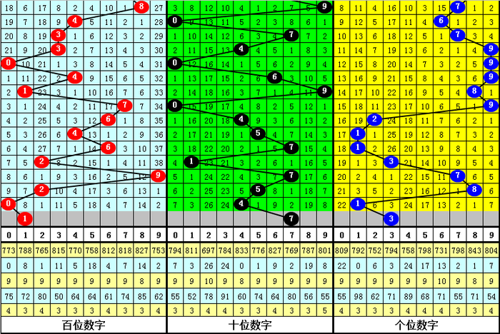 1、号码0-9出现开出频次分别为:号码8出现22次,号码7、9出现21次,号码3、6出现19次,号码0、4出现15次,号码1、2出现14次,号码5出现11次。一般来说,表现最冷的三码:1、2、5不会同时出现,本期杀一码:5;表现最热的四码:3、7、8、9中一般会出现奖号,本期注意号码;7。
